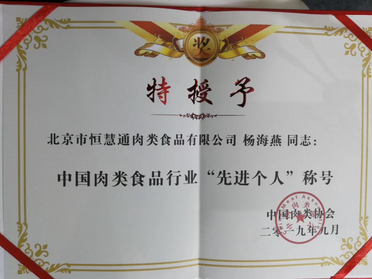喜訊:我公司楊海燕總經(jīng)理榮獲2019年中國肉類食品行業(yè)